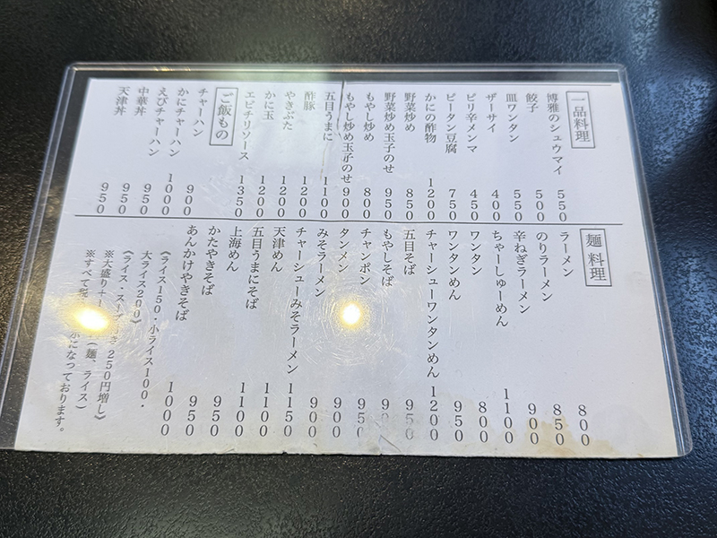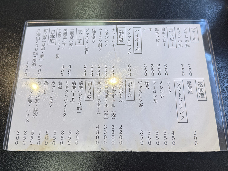 店内はテーブル席のみで窓際にはボトルキープされた焼酎の瓶が並ぶ。夜は飲む常連の方が多いとお見受けする。メニューにもそれらしい足跡が。