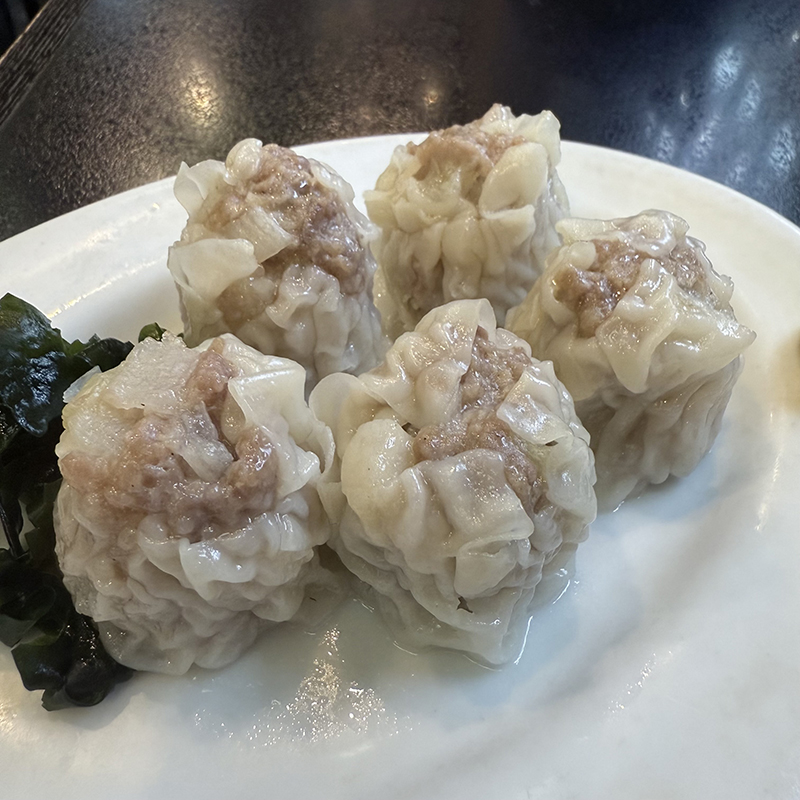 浅草開化楼のものを使用している皮はしっとりと瑞々しい。餡も肉っ気たっぷりでジューシーな仕上がりで秀逸。