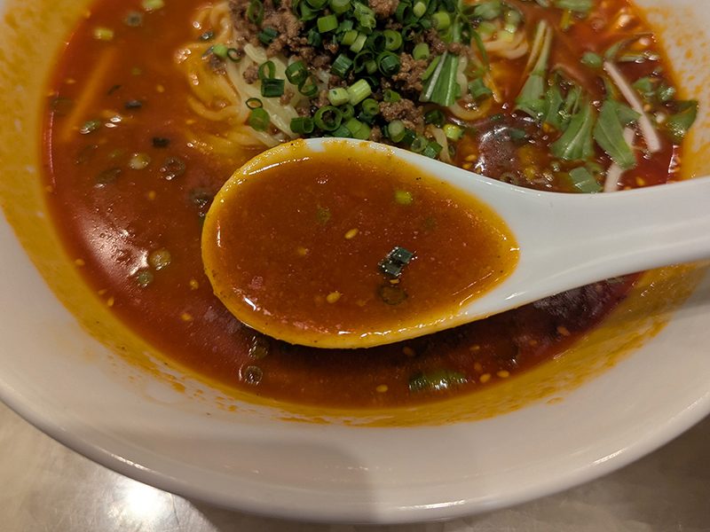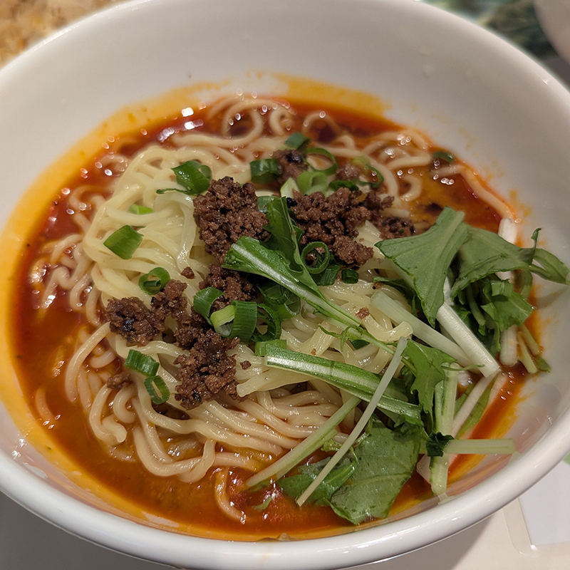 担々麺は一般的な担々麺とは異なりかなり本場寄りの味なのだろう。ごまの円やかさはほとんど感じられないストイックなタイプ。スープはいかにも辛そうな色彩だが、そこまで辛くはない。