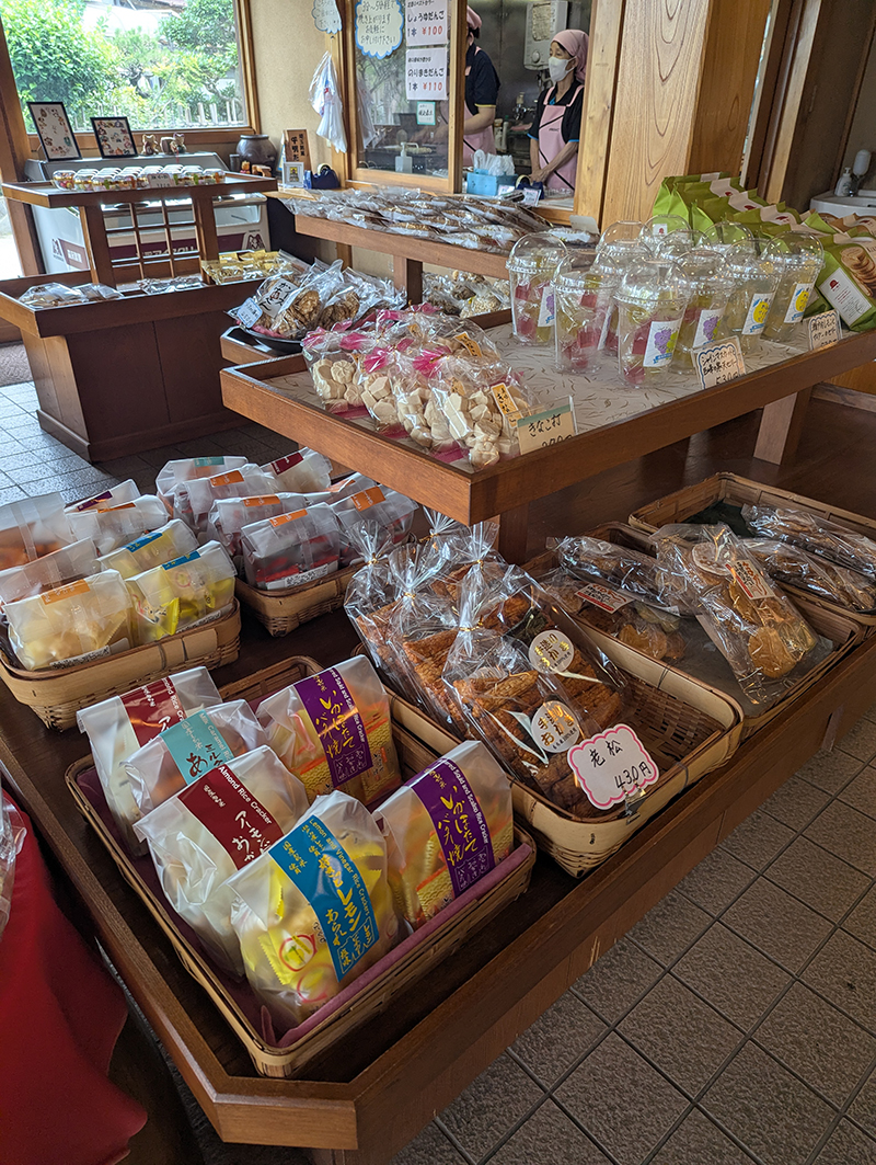 店内にはだんごだけでなく、せんべいなどの米菓をはじめ幅広い商品が並ぶ。