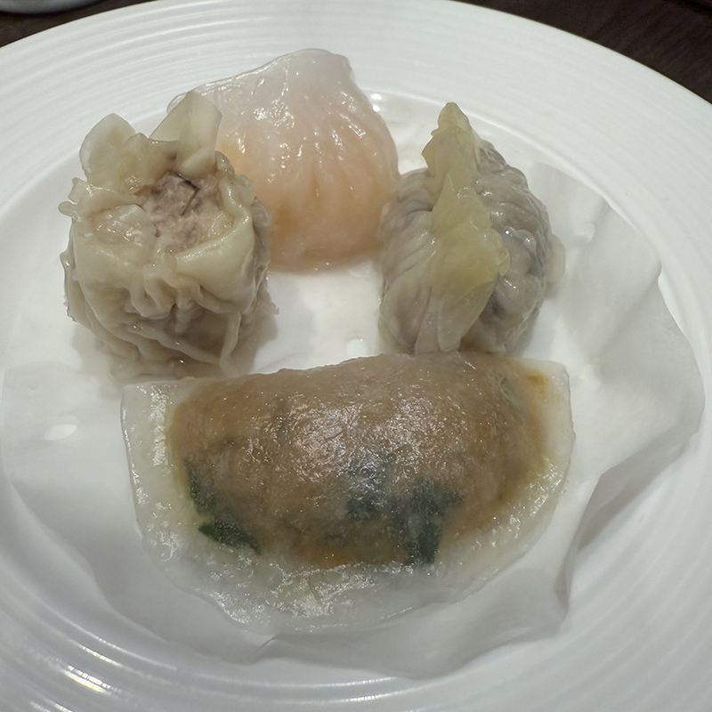 セットは焼売、エビ蒸し餃子、フカヒレ蒸し餃子、野菜蒸し餃子の4種類。どれも上々の出来だが、野菜蒸し餃子が想像以上に良かった。