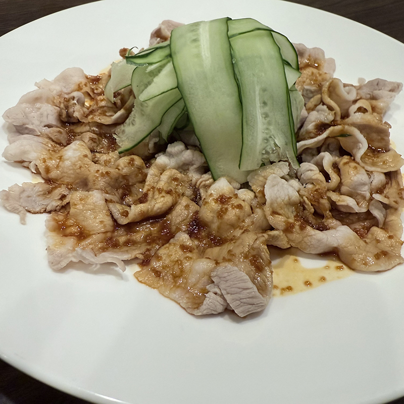 旬のおすすめからの選択。薄切りの豚ロース肉に辛いタレが掛かった料理でキュウリがいいアクセントになっている。結果的にこの分が少し多かったかなと少し反省。