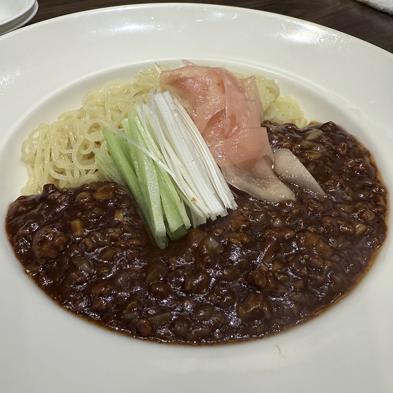 お勧め麺・ご飯メニューからこちらをチョイス。前回は温かいザージャン麺だったので今回は冷やしで。辛し肉味噌にキレイに切り揃えられたキュウリ、ネギ、生姜が入る。ジャージャー麺の様に全体を混ぜ合わせて頂く。辛味もしっかりとあってこれからの季節にいい。ただ個人的には温かい麺も捨て難いところ。