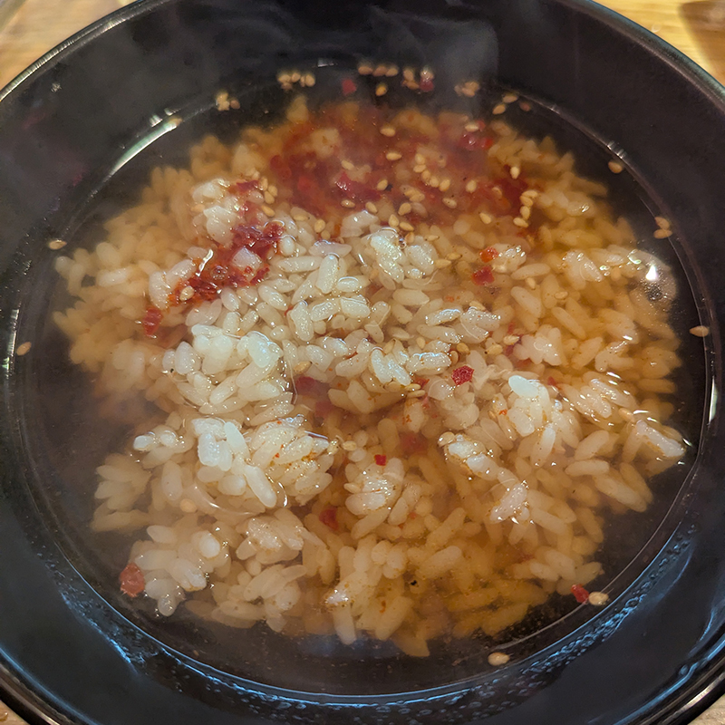 一番の目的は前回、頂くことが出来なかったお茶漬けを。こちらはごはんの上に残ったタレと番茶を掛けて頂く料理で、肉の旨味が溶け出したタレが実にいい塩梅。
