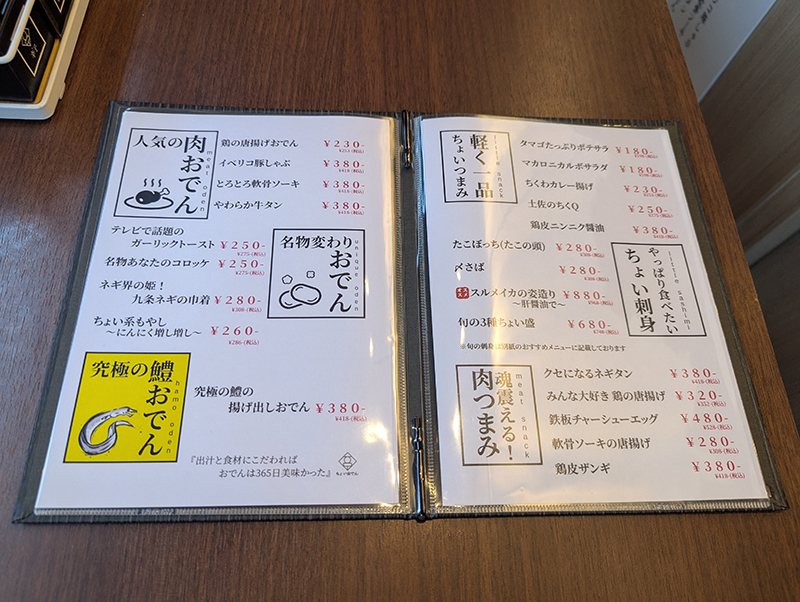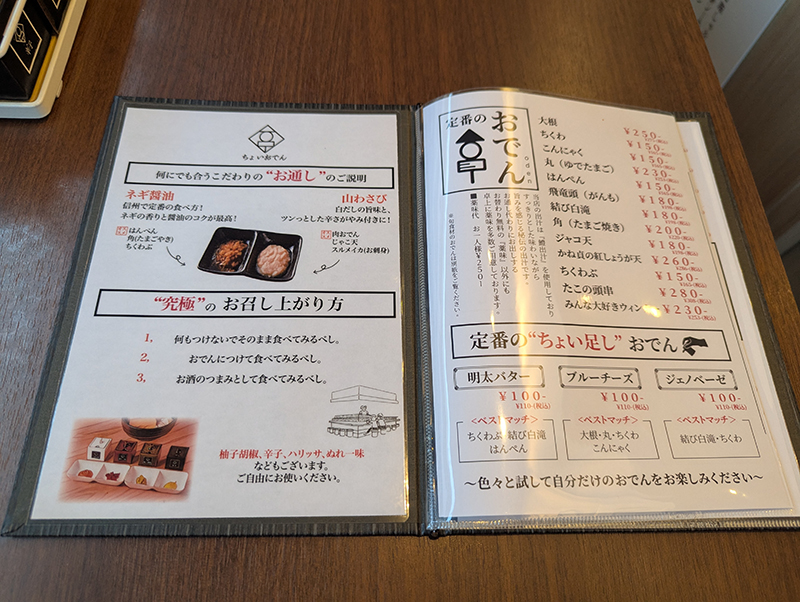 定番メニューとお通しで供されるネギ醤油と山わさびの説明。薬味としては辛子が最強だとは思うが、種によってはなかなかの好相性だった。特に山わさびは色々なおでん種との相性がいい。