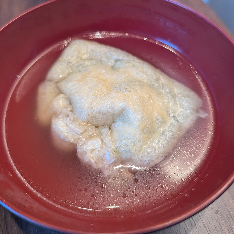 続いて、九条ネギの巾着。お揚げの中には九条ネギのみじん切りがぎっしりと詰まっている。思ったよりも変わり種という印象は薄い。
