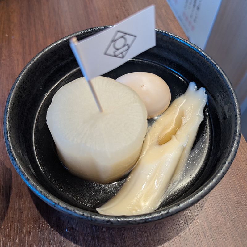 一般的なおでん種から大根、玉子、ちくわぶを。恐らく、どれも注文が多いネタだと思われるが、そのせいか、まだ味が染みきってない印象だ。どのおでんにも言えることだが、出汁は昆布の香りが強く、京風ではあるがしっかりと塩気を感じる。