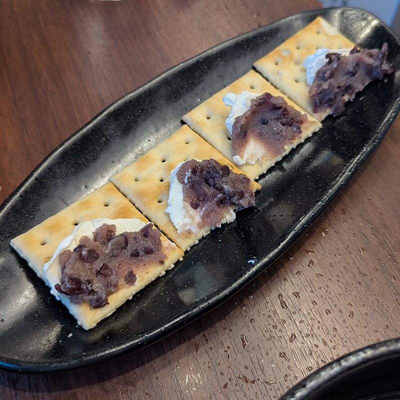 アンバターとクリームチーズは餡の甘さは殆ど感じられず、チーズの塩気と相まっていいおつまみに。