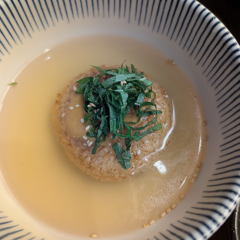 締めには鱧だしを使ったうにの焼きおにぎりを。鱧だしというだけあっておでんとはひと味違って上品な仕上がり。焼きおにぎりではあるが、お茶漬け風に頂く。