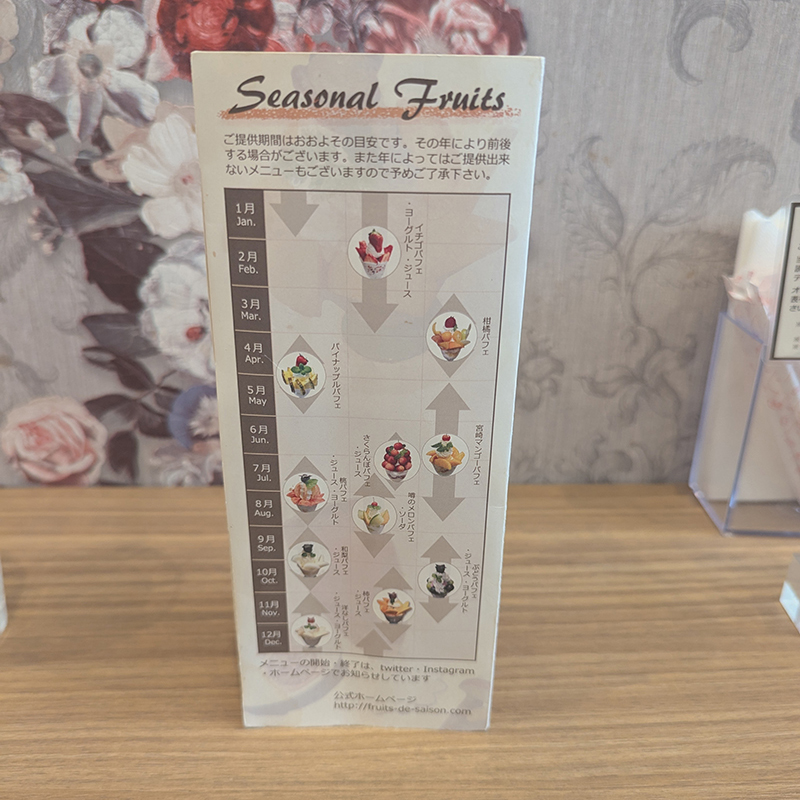 フルーツジュースや季節のパフェがメインで季節の分布図がわかるメニューが用意されている。