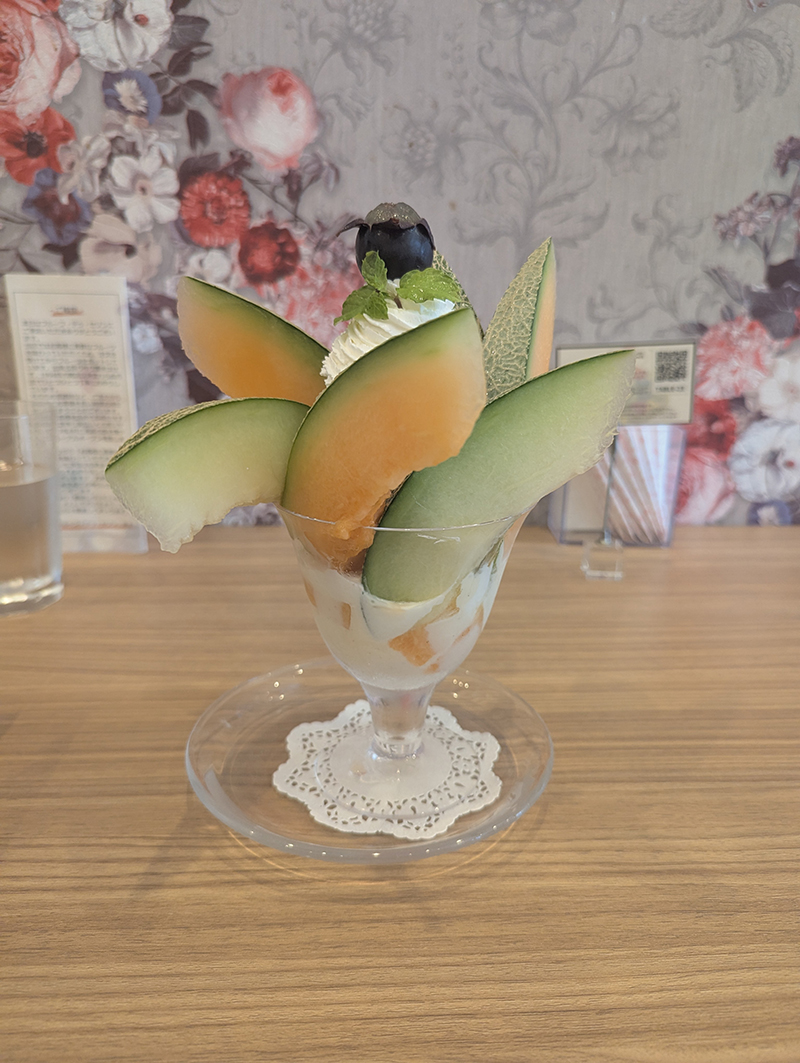 注文から10分ほどで供された。パフェには2種類のメロンが交互に飾られていて上にはぶどうとミント、ホイップクリームが乗った贅沢なひと品。