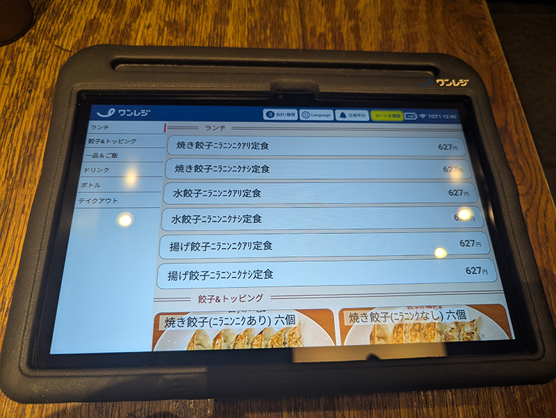 注文はいま時のタブレットに変わり、当然ながら値段も当時よりも高い。餃子1皿のセットであれば627円だが、2皿にすると1,000円をギリギリオーバーする。
