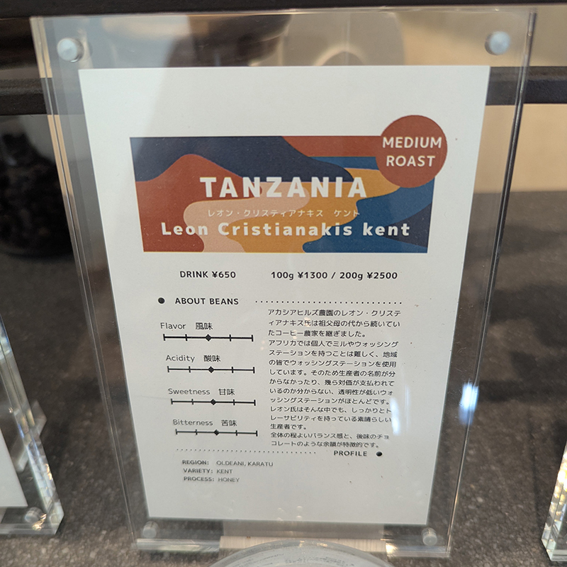 酸味が強そうなものが多かったので中でも、比較的深煎りで酸味が穏やかなそうなタンザニアを購入。生豆にも拘っているせいか、少々お値段は高め。
