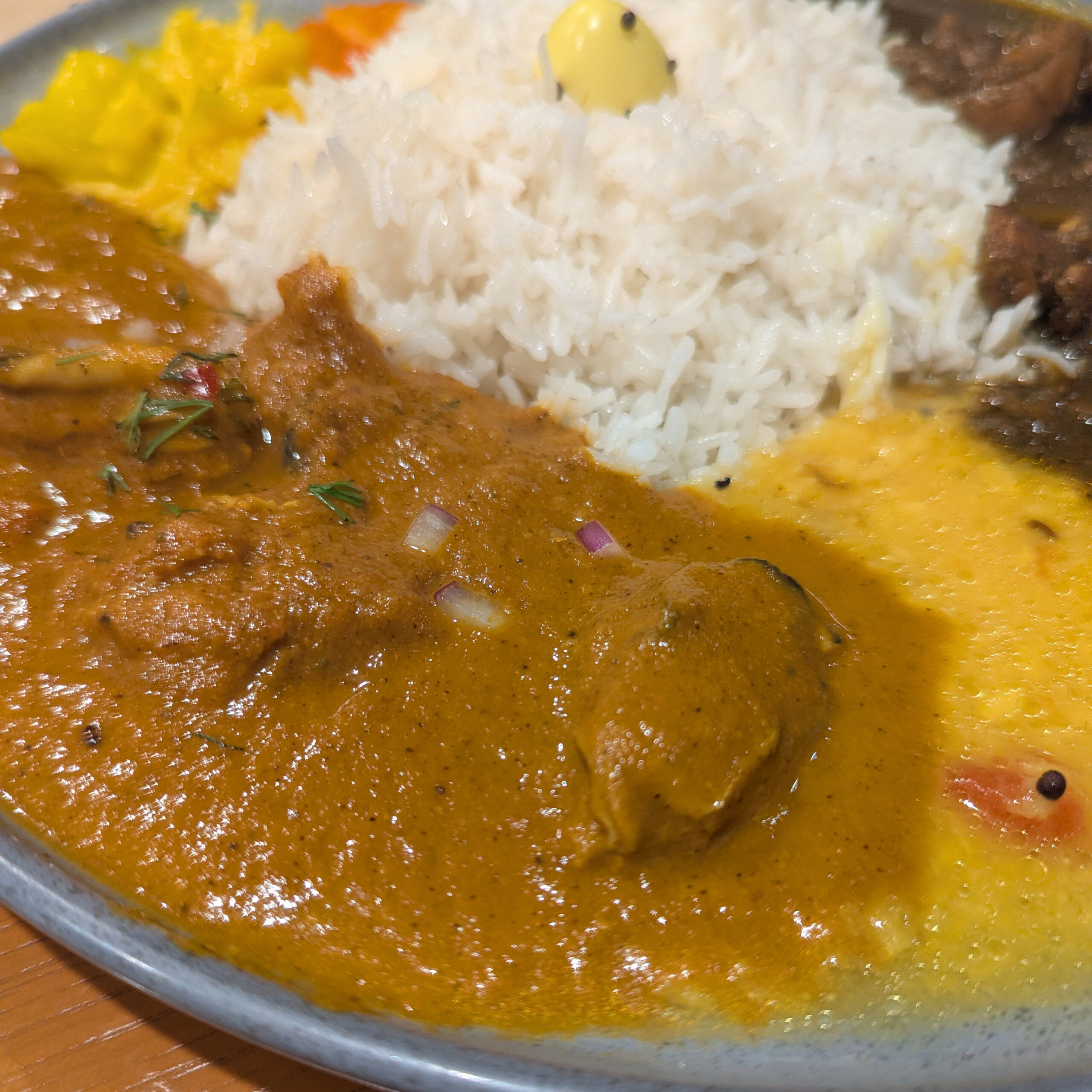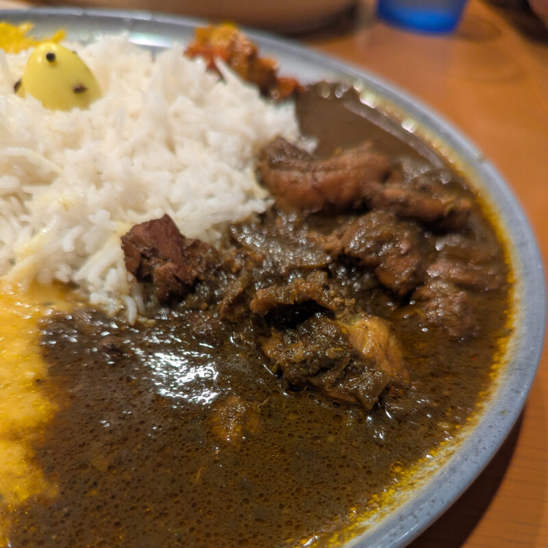 右がダークチキンカレー、左がカニだしカキカレー。間にあるのはダール。そして奥にはアチャールが。