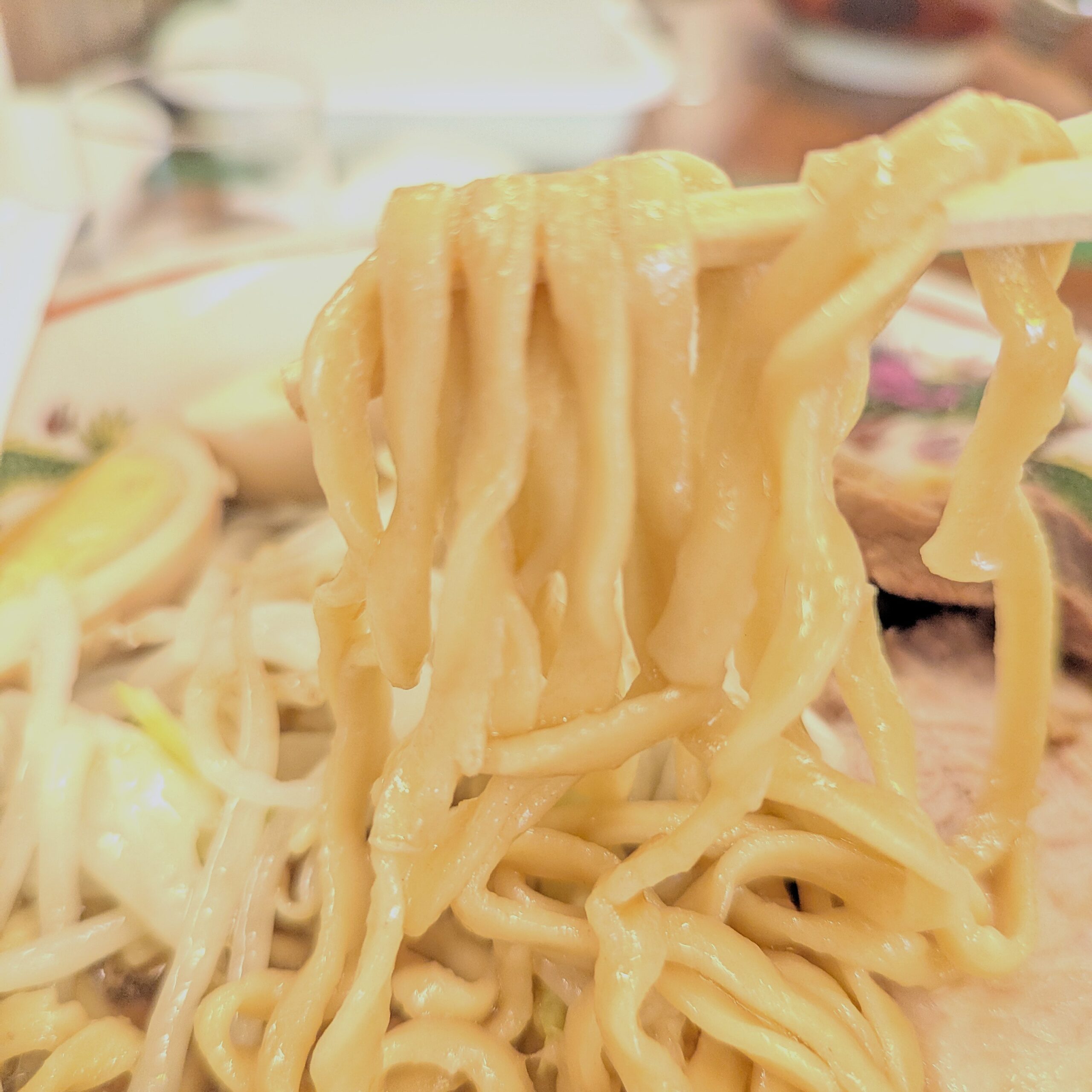 平打ちタイプの太麺は固めの茹で加減でややちぢれている分、スープとも良く絡む。