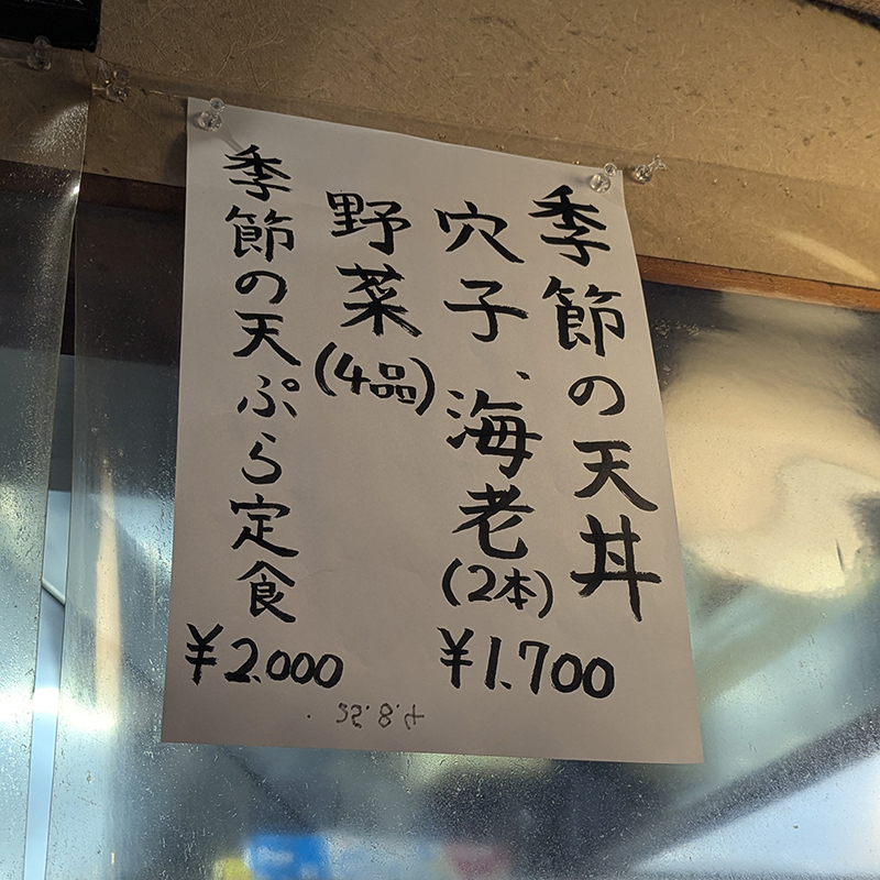 天丼の種類が豊富だが、特に目を引いたのは季節の天丼。品数が多く魅力的だったのでこちらを注文。