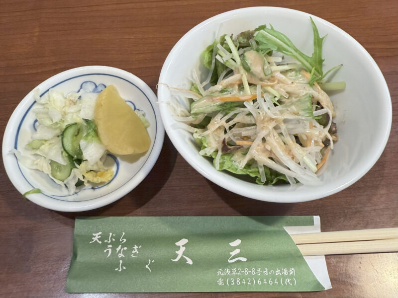 まず、セットの漬物とサラダが。天丼にサラダが付いてくるのは珍しい。しばらくして真打ちの登場。