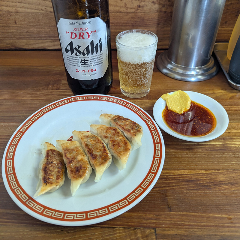 まず、餃子2枚とビールを注文。ビールよりも最初の一枚目が先に供されるのもこのお店らしい。