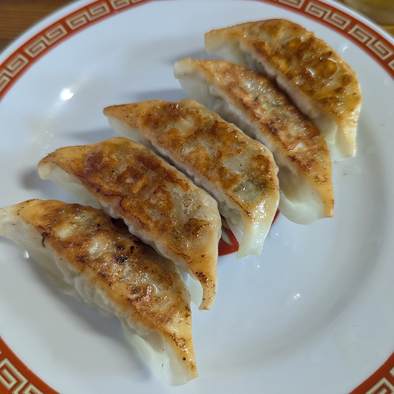 3枚目もほどよい焼色。このタイミングでもやしの小皿が出てくる。この日は餃子のみでサクッと終了。