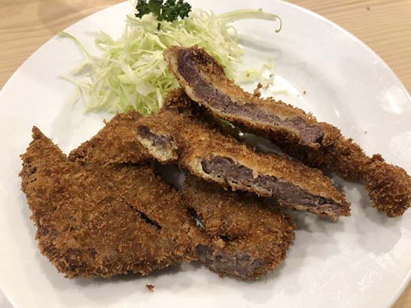 看板にも書かれているビーフかつれつ。見ればハーフサイズがあったので、ビールのアテに注文した。