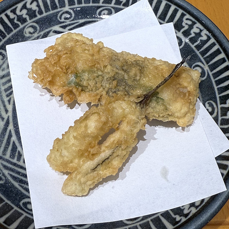 天ぷらはめごちとおすすめからハモ梅しそ巻き天麩羅。衣はサクサクと揚がっていて、油切れもいい。特にハモは実がほっこりとして美味。