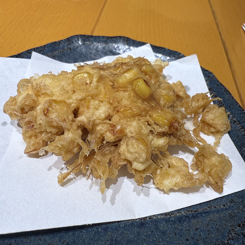 続いて、とうもろこしのかき揚げ。とうもろこしは揚げることで甘みが増す。