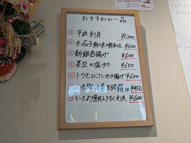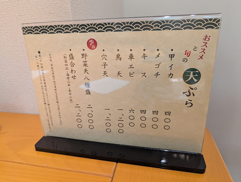 前回は牡蠣南蛮を頂いただけだったが、天ぷらをメインとしたつまみも充実している印象があったので。