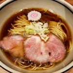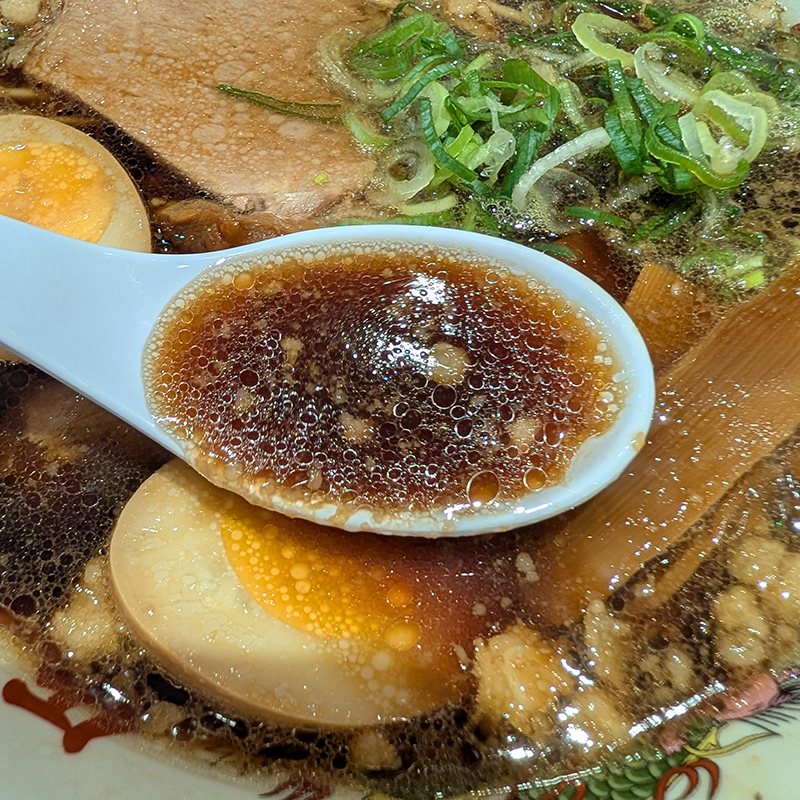 煮玉子のみトッピング。黒醤油というだけにかなり醤油の色が濃い。逆に背脂はわずかに浮いている程度。