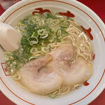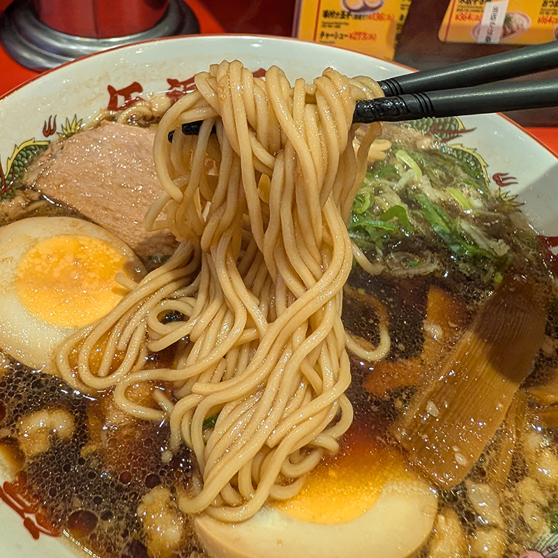 中細麺はやや平打ちになっているので余計にスープが絡む。チャーシューは筋張っていて固く、ボソボソとした食感でいまひとつ。