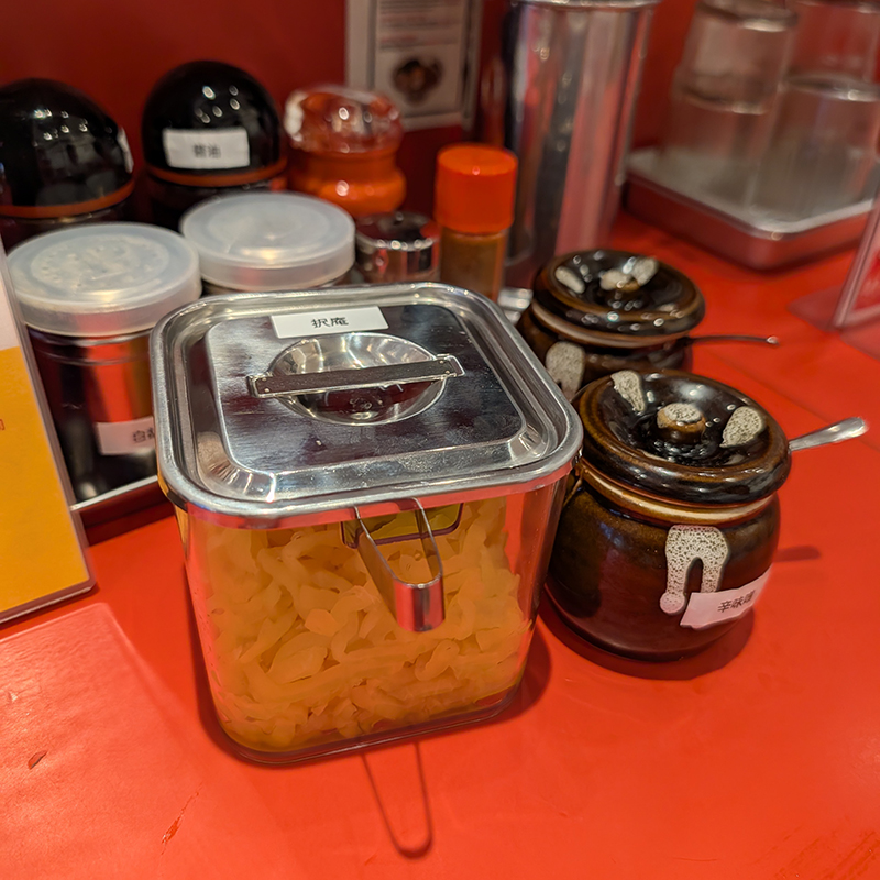 卓上には調味料類が並ぶが沢庵があるところが面白い。
