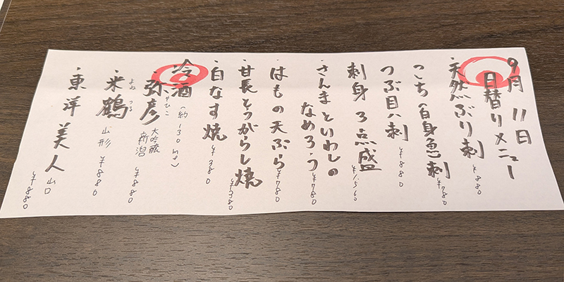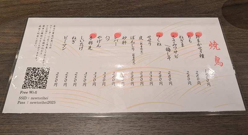 店内は1階はカウンターのみ。2階にも席がある様だ。この日はやきとりメインで頂いたが、日替わりでは刺身なども用意されている。そして、こちらがやきとりメニュー。