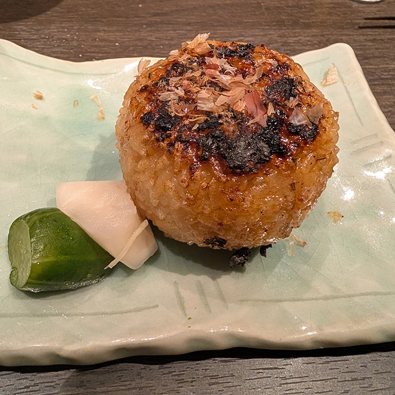 締めには焼きおにぎりを。丸に近い形のおにぎりで厚みがある。ふんわりとした食感なのも焼きおにぎりとしては不思議な感覚。お新香も添えられているのは嬉しい。