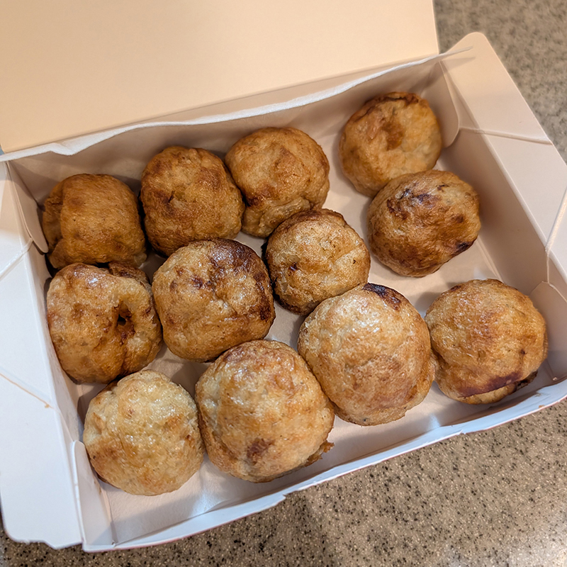 味の種類は豊富だが、オーソドックスな元祖たこ焼きを購入。生地に出汁の旨味が溶け込んでいるのでソースを付けずにそのまま頂くのがこちらのたこ焼きの特徴。冷めても美味しいというのがキャッチフレーズ。