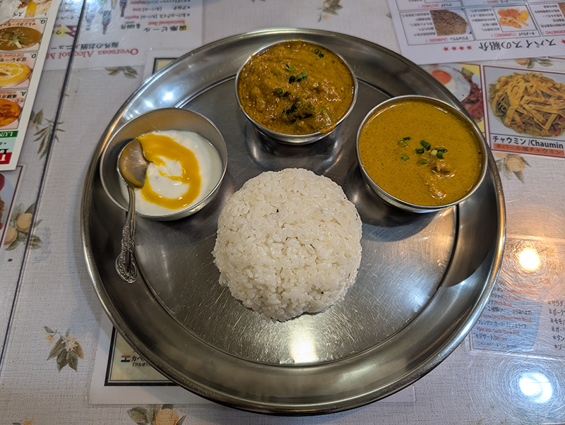 カレーは単品メニューから選択することができる。今回はチキンカレーとメニュー先頭を飾る薬膳カレーを。ナンまたはライス、もしくはその両方を選択できる。今回はライスで。更にデザートも付いてくる。