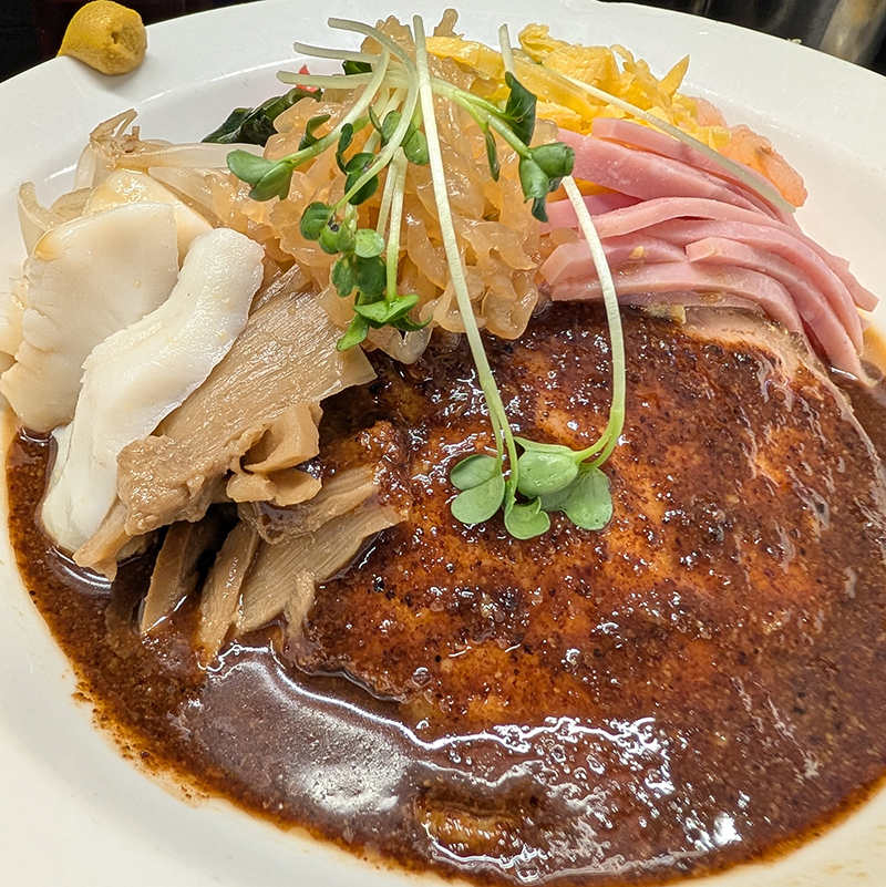 打ち立ての中太麺はもっちりとしてコシが強く麺の旨さがピカイチ。色の濃い味噌ダレも麺に負けない強さで上品なジャージャー麺の様な趣き。チャーシューを初め具材も美味しく冷やし中華として完成度が高い。