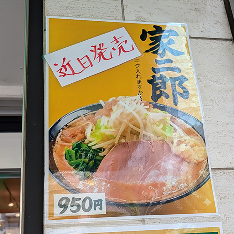この時に気になったメニューが貼られていた。それは近日発売とある家二郎。近日ということなのでこの日は通常のメニューから上ラーメンを。