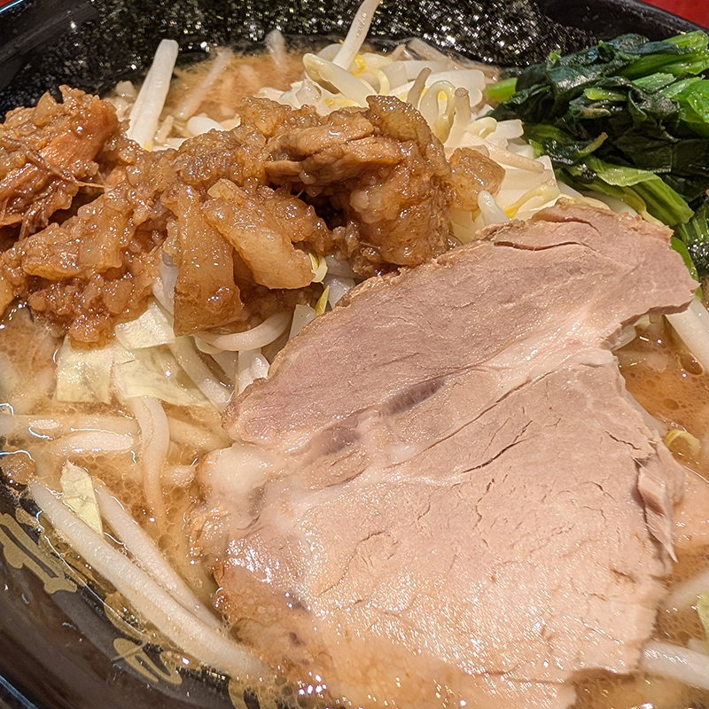 写真の見た目もそうなのだが、二郎というよりは見た目は明らかに家系。具材で違うところはもやし、味が染みた脂と肉が乗っていること。ほうれん草は家系を踏襲している。