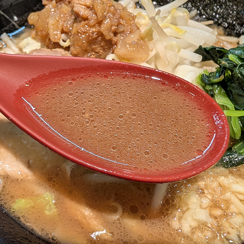 まずはスープをひと口。やはり二郎と言うよりは家系の味。スープの濃さは家系の味うすめよりもうすく感じられた。