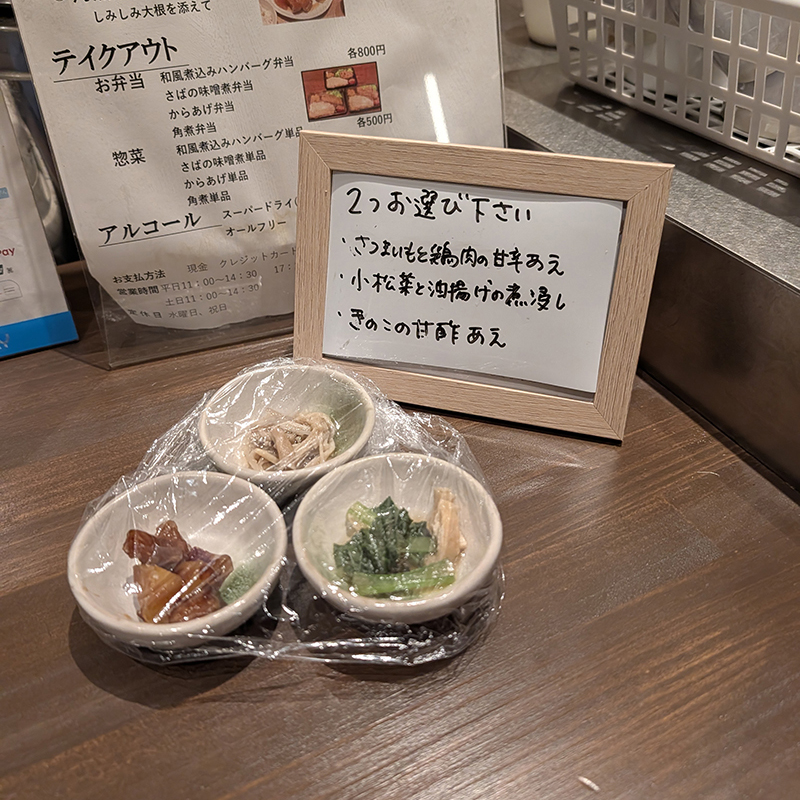 定食にはいずれも副菜として小鉢がついていて、こちらの3種類の中から2種類を選択することができる。