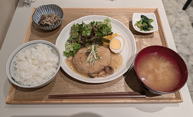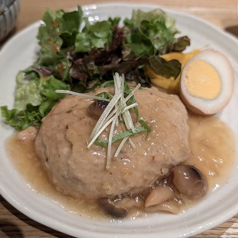 豆腐を使用したハンバーグというだけあって口当たりが柔らかく、思ったほど物足りなさも感じられない。