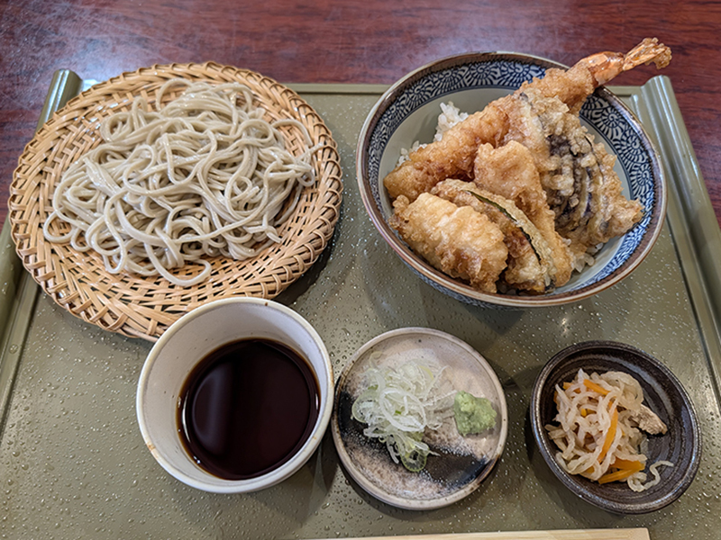 天丼にはえび、いか、かぼちゃ、なすにとり天が入るところが珍しい。他に小鉢に切り干し大根が付く。
