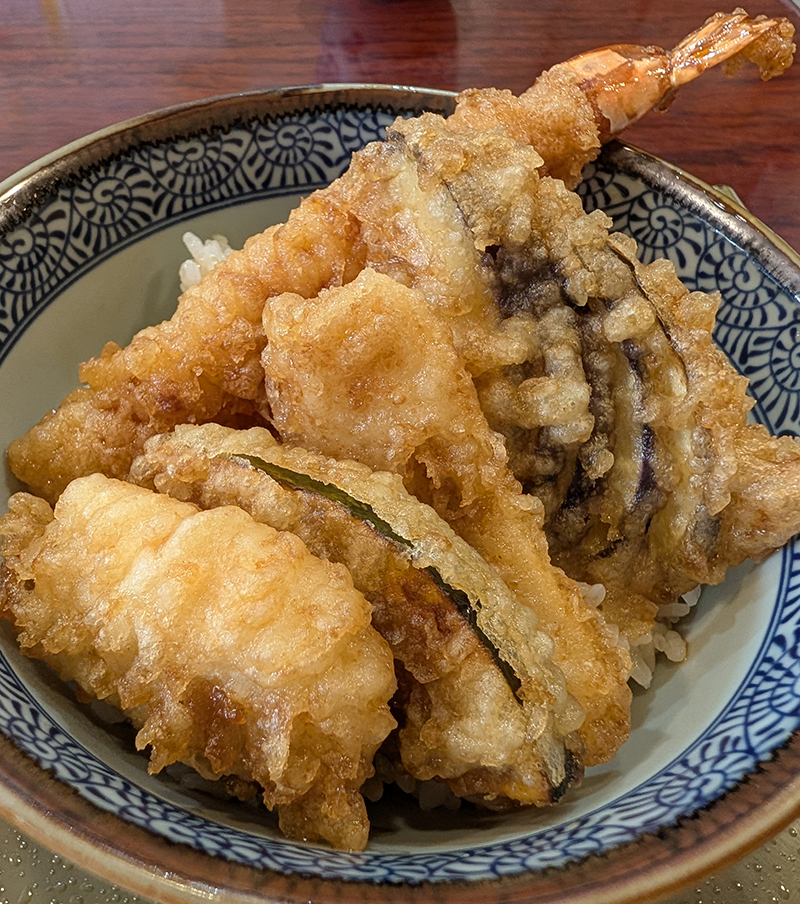 衣は多めだがサクサク感は残っていて甘辛い味付けの天つゆがほどよく絡む。