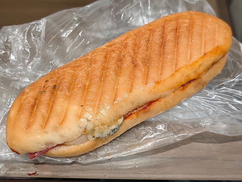 1つはゴルゴンゾーラとベーコンとじゃがいものパニーニ。中はピザソースになっていて、生地は歯ごたえがしっかりとあるが、中のじゃがいもの柔らかい食感とのコントラストが面白い。