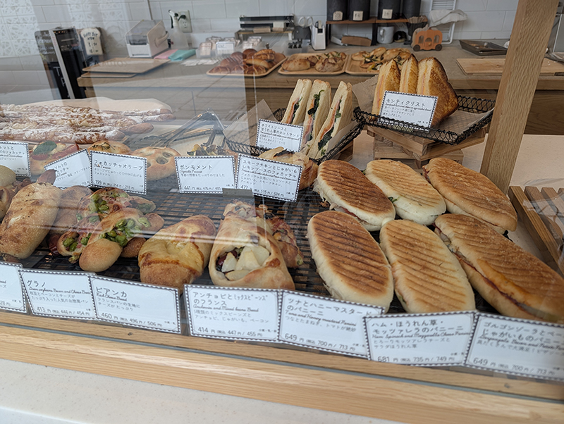 ショーケースには見るからに食欲をそそるパンが並ぶ。店内にはイートインスペースも用意されているだけにおかず系のパンが主流。今回は2種類をテイクアウト。