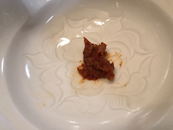 イメージとしてはもみじおろしに近いが、水気がなくペースト状になっているためポン酢が薄くなる心配がない。発酵調味料ではあるが豆板醬ともまた異なる。ポン酢に混ぜるとこんな感じに。