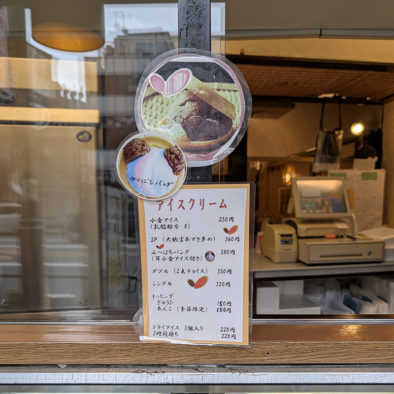 ぱっと見の印象ではテイクアウト専門店の様に見えるが、脇に入口があって店内で頂くことも可能だ。今回は名物である小倉アイスをその場で頂き、別途、あんみつをテイクアウト。