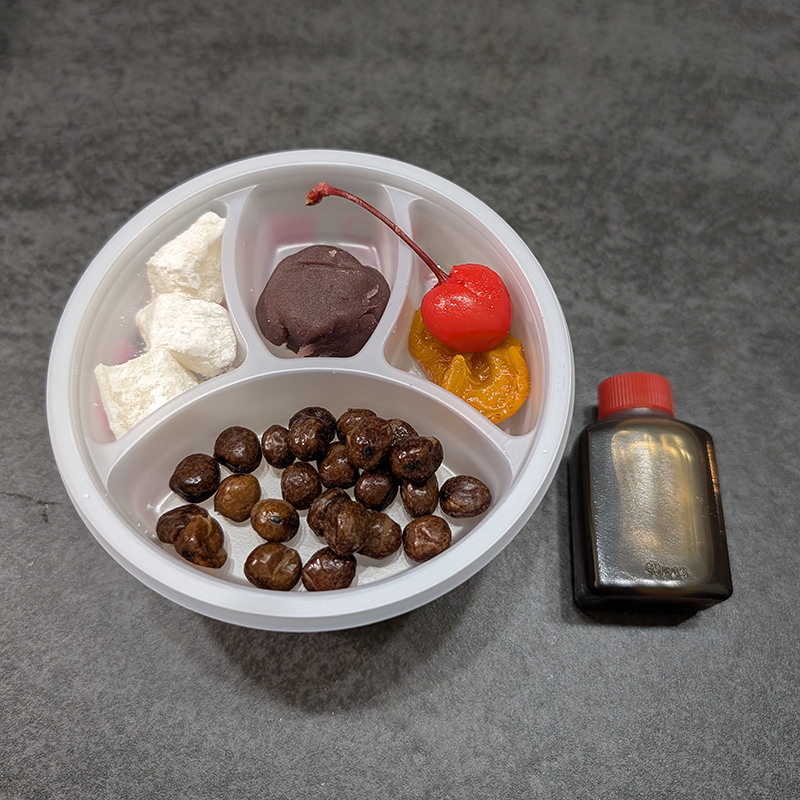 あんみつは餡は少なめだが、黒蜜はたっぷり。一般的な寒天に比べて一回り小さく、ほどよい柔らかさで食べやすい。