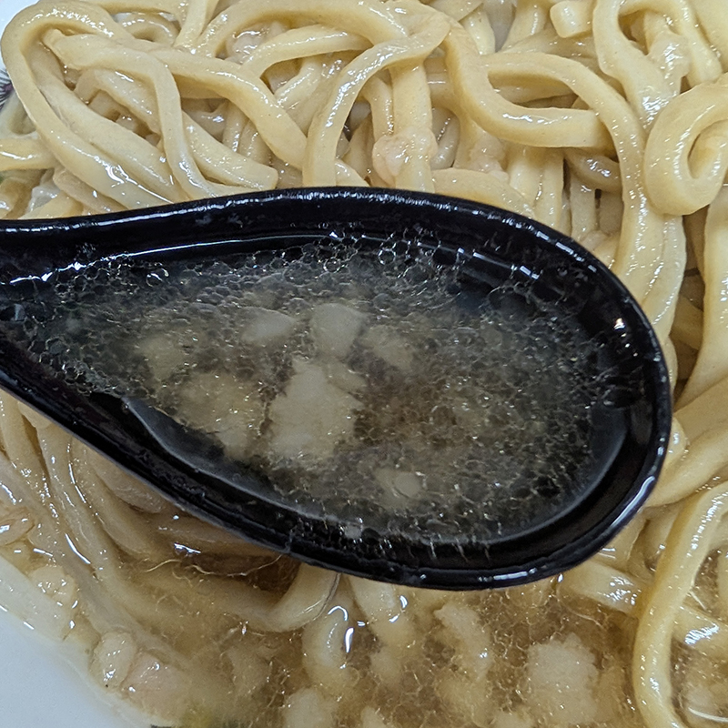 背脂が入ったスープはカネシ醤油がしっかりと香る。濃いめの味付けなので太めの麺にも負けていない。