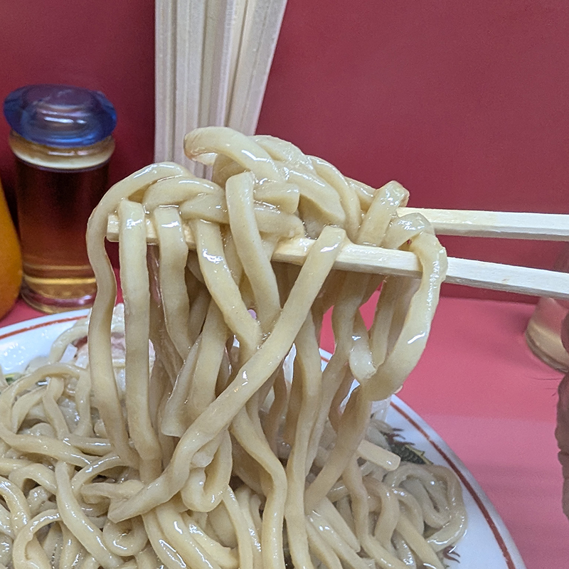 平打ち麺はつるつるとした食感で弾力性がありもっちりとコシが強い。