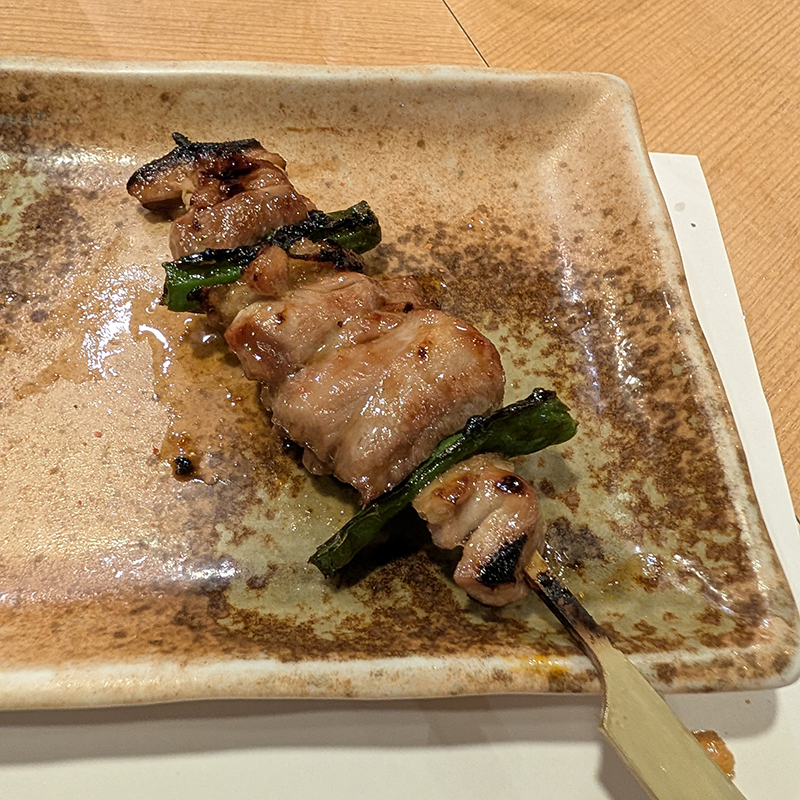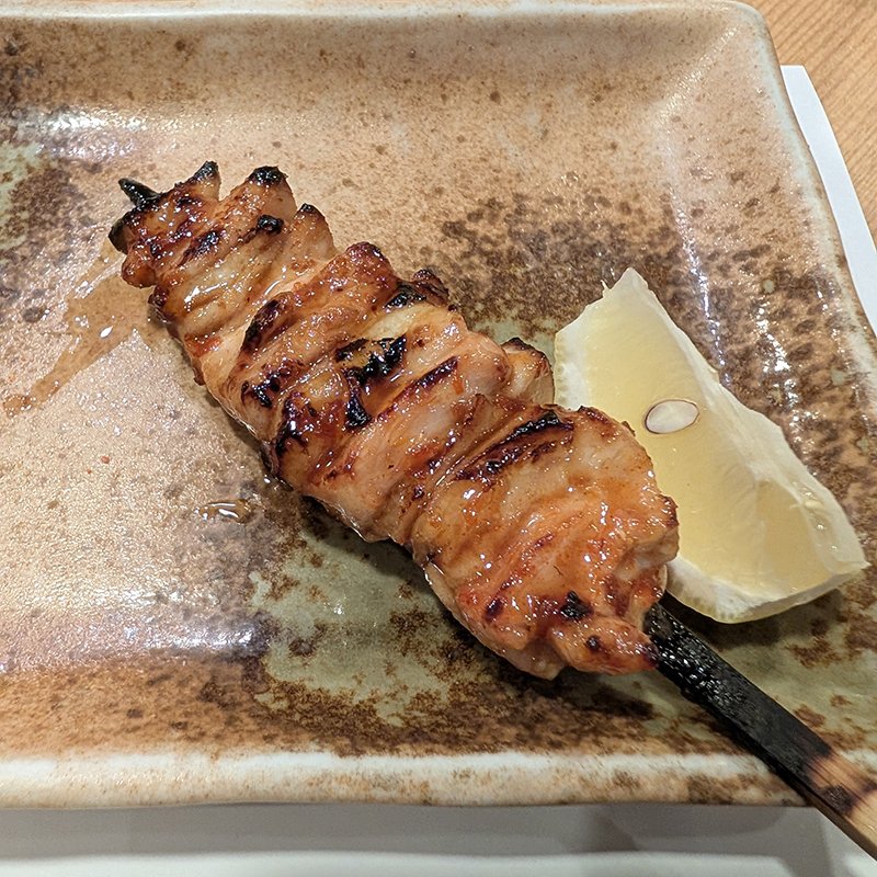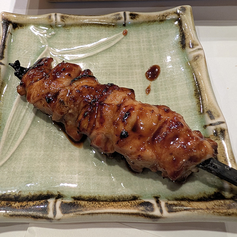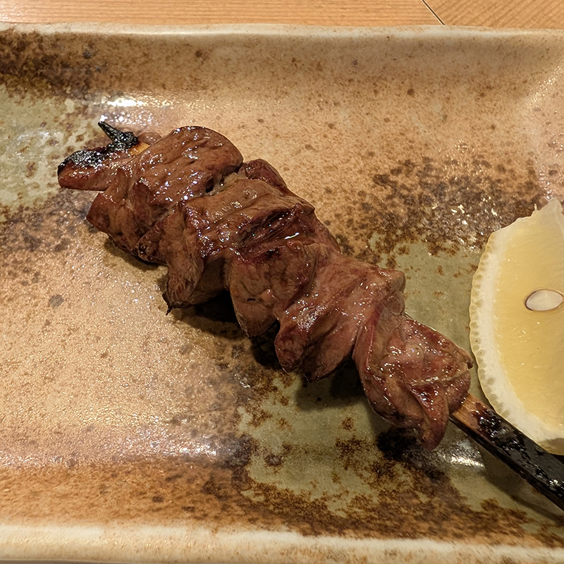 肉はしっかりとした食感で旨味がある。タレは塩梅よく、辛ダレだけに少しピリリと辛くがほどよいアクセントに。全体的に串一本のボリュームが多い。